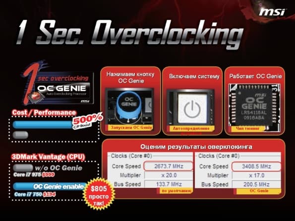 Первое решение — полноценный процессор разгона системы, получивший название OC Genie. Интерфейс её предельно прост: для начала оверклокинга необходимо нажать специальную кнопку на системной плате, и через секунду OC Genie самостоятельно выставит подходящие параметры процессора и памяти. Все измененные параметры отслеживаются при помощи микросхемы ОС Genie Watchdog, также учитывающей общее состояние системы и перезагружающей её в случае «зависания».