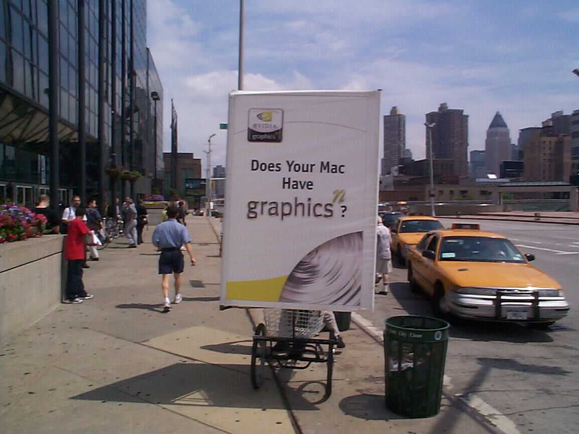 Рекламные плакаты NVIDIA можно было увидеть повсюду. ATI было заметно куда меньше, она лишь показывала совсем недавно представленный Radeon VE Mac Edition и USB ТВ-тюнер XCLAIM TV USB Edition с корпусом а-ля iMac.