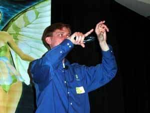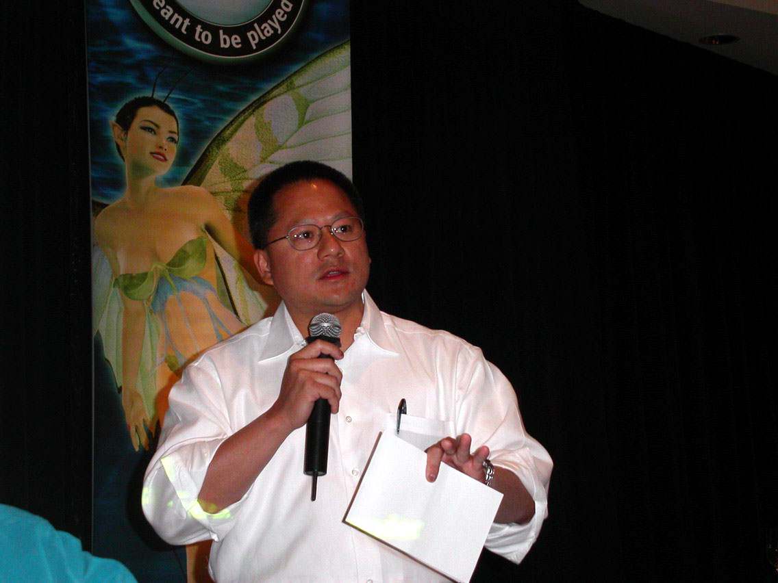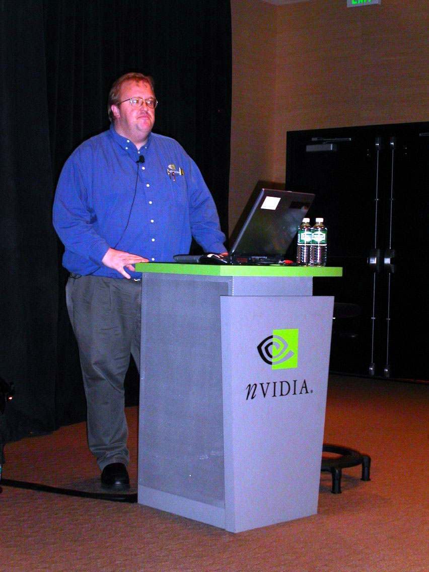 Его выступление охватывало как положение компании NVIDIA на сегодня, так и перспективы развития 3D-графики на рынке PC (ну и немного было сказано и по приставкам). Но главным лейтмотивом доклада являлись особенности развития PC сегодня. Куда движется рынок ПК? Прежде всего в сторону все активного развития сетевых решений и технологий, а это прежде всего Интернет. Что это может дать для продвижения 3D-графики? Прежде всего доступность по оперативному получению свежей информации о новых решениях в области 3D, внедрение высокоскоростных каналов позволит уже достаточно легко получать объемистые массивы инструментов для пользования последними новациями, демо-версии продуктов и т. п.