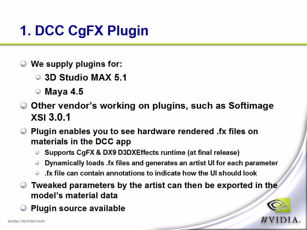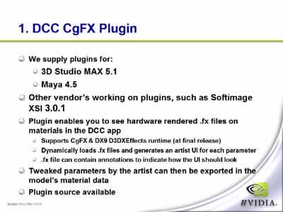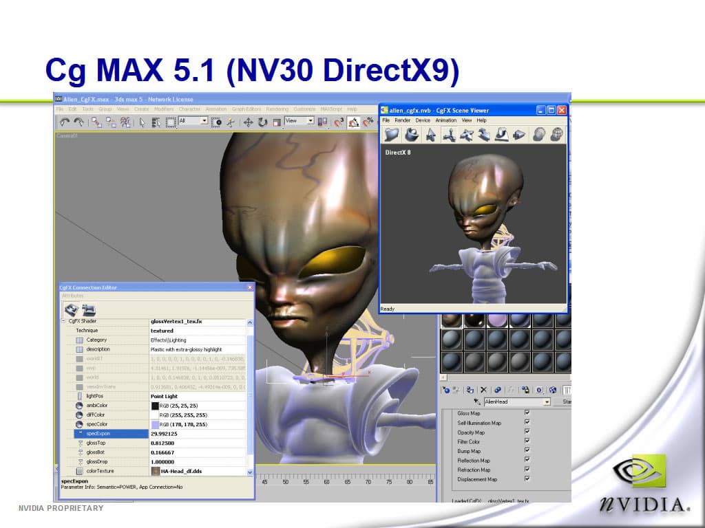Если что-то вам не нравится, то прямо здесь же, не выходя из 3ds max вы можете отредактировать под себя исходный код шейдера, что, безусловно, прибавляет гибкости при использовании данной технологии. Шейдеры подключаются в виде .fx файлов. Себястьян обещал, что в самое ближайшее время данный плагин и наборы .fx файлов появятся в свободном доступе на сайте NVIDIA. Будем ждать и пробовать, так как на мой взгляд, данная технология в какой-то мере уникальна и весьма удобна для людей, занимающихся моделированием. Так же, подобные плагины появятся и для MAYA и для SoftImage, а через некоторое время данный механизм должен быть встроен в движки этих программых продуктов.