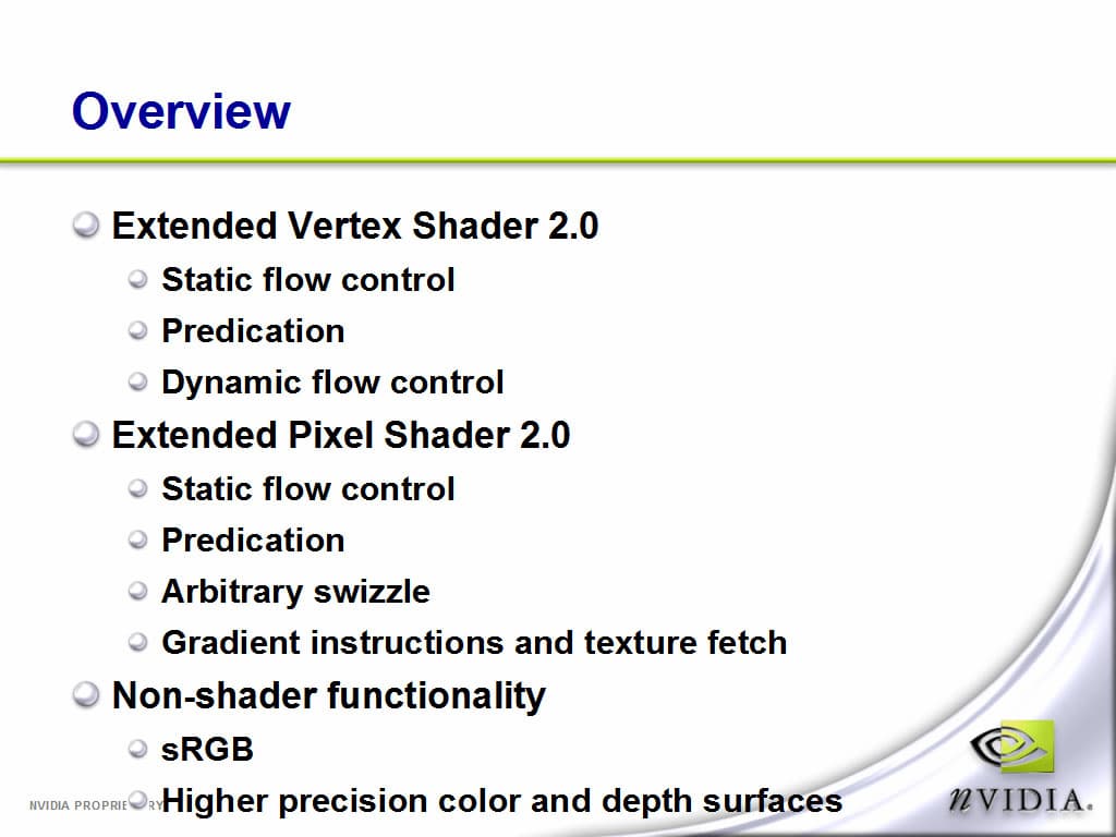 Он подчеркнул четыре наиболее важных момента в общей политике компании. Я хотел бы отметить один из моментов в своем очерке. На мой взгляд, самый важный момент — это использование унифицированной версии драйвера (UDA — unified drivers architecture). Как отметил Алан, любой пользователь может скачать новую версию драйвера и этот драйвер подойдет к использованию с его видеокартой, будь то TNT2, GeForce256 или GeForce FX. Алан так же отметил, что на любых картах при использовании новых драйверов пользователь получит приросты в производительности, но с этим я позволю себе не согласится. Я тестирую новые версии драйверов и вижу реальную картину. :-) Тем не менее, унификация драйверов более лояльна как к пользователям, так и к разработчикам. Из минусов унификации я бы отметил только один момент. Через некоторое время, когда количество чипов превысит, скажем, тысячу (на сегодня драйвера поддерживают порядка 124 (!) различных чипов), то объем драйверов будет велик и разработчикам будет сложно проводить оптимизации под все существующие чипы.