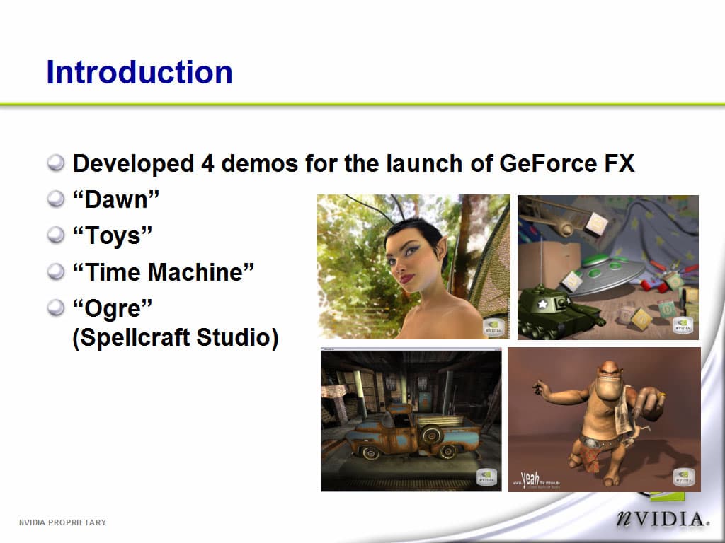 После небольшого вступительного слова, Джон Спитцер (John Spitzer) приступил к описанию новых наработок компании. Он рассказал про архитектуру GeForce FX, при этом продемонстрировал весьма интересные демо-программы, специально разработанные для демонстраций возможностей нового чипа.