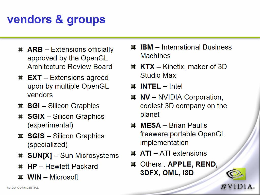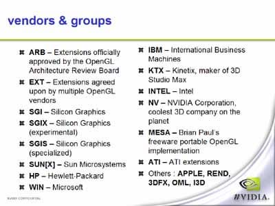 Тем не менее, именно эта лекция мне понравилась своей информативностью. Что, впрочем, и не мудрено, так как сама NVIDIA считает приоритетным развитие этого стандарта и наиболее полную поддержку обеспечивает именно для этого стандарта в первую очередь. DirectX, по какой-то причине, не так привлекателен для NVIDIA. Если попробовать проанализировать, то причины вполне можно выяснить. Рискну предположить, что дело кроется вот в чем: OpenGL является открытым стандартом. То есть, любой желающий может сделать некое расширение, предложить его на рассмотрение консорциуму и, если все будет хорошо, это расширение будет принято. Вы помните, сколько расширений в NVIDIA OpenGL? Компания, имея в штате высокопрофессиональных технологов и программистов, может разработать весьма нужные и полезные расширения для стандарта и может диктовать свои правила. Ведь в консорциум OpenGL входит огромное количество компаний и они довольно адекватно подходят к рассмотрению вопроса.