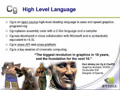 После этого Крис Винн (Chris Wynn) поведал интересные вещи про языки программирования высокого уровня, созданные специально для программирования видеоускорителей, такие как Cg (C for graphics) от NVIDIA и HLSL (High level shader language) от Microsoft. Само собой, что наибольшее внимание Крис уделил языку Cg и его особенностям.