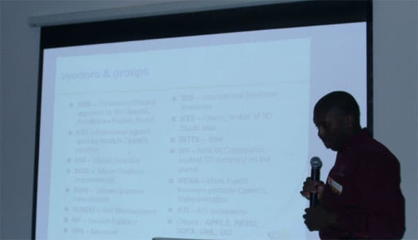 В это самое время, Крис рассказывал про новые OpenGL расширения для применения в программировании новейших ускорителей. Лекция оказалась, на мой взгляд, излишне информативной, так как, учитывая несколько приглушенный свет, у народа к середине лекции стало откровенно сводить челюсти. :-)