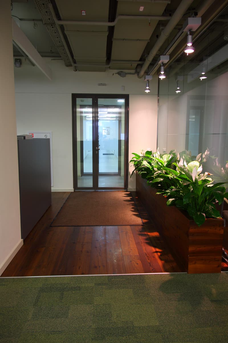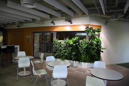На всех фотографиях видно, что для лучшего ощущения пространства, потолочные панели есть только над рабочими зонами, а в проходах потолок оставлен открытым, и такой hi-tech выглядит достаточно любопытно. В то же время размещённые в нескольких местах уголки с живыми растениями показывают, что NVIDIA — это зелёная компания во всех смыслах этого слова. В итоге, в офисе получилось интересное сочетание индустриального дизайна и природы: