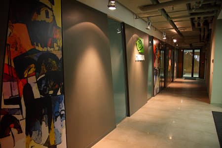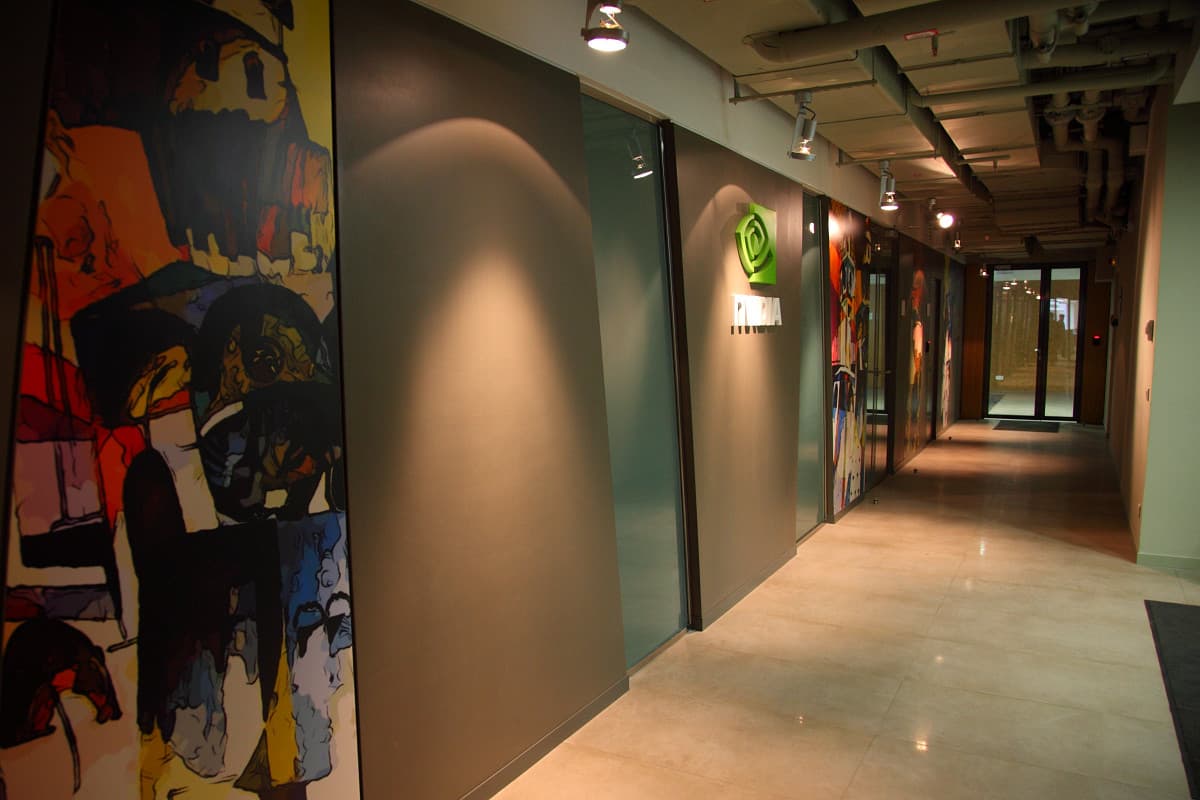 Во время больших собраний московского коллектива компании NVIDIA, насчитывающего более 100 человек, огромные окна второго этажа закрываются, а на их место спускается большой экран, на котором транслируются презентации.