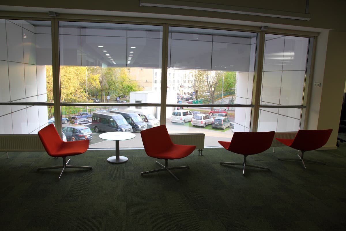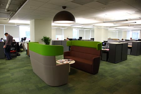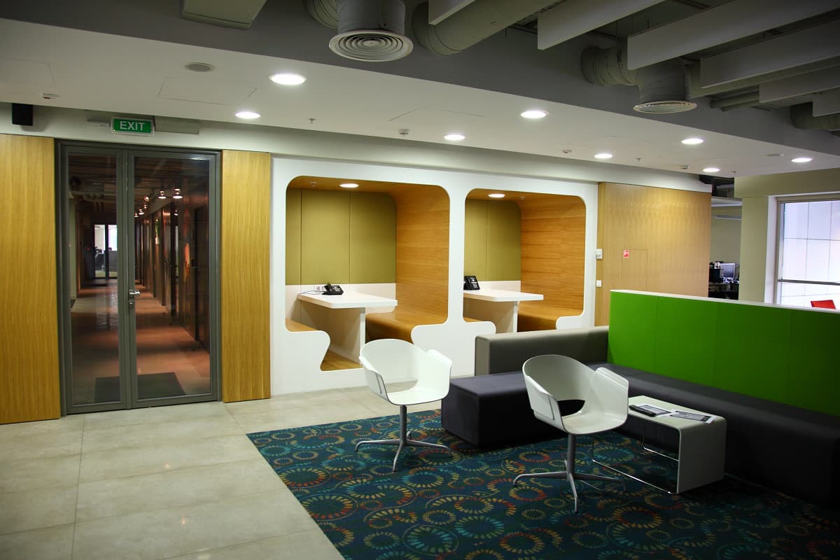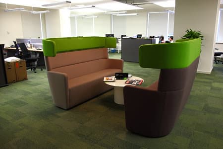 Уютные диванчики, стоящие напротив друг друга — это лишь одна из многочисленных зон для отдыха в офисе компании. Это места, где можно пообщаться с посетителями и сотрудниками по различным вопросам в удобной обстановке.