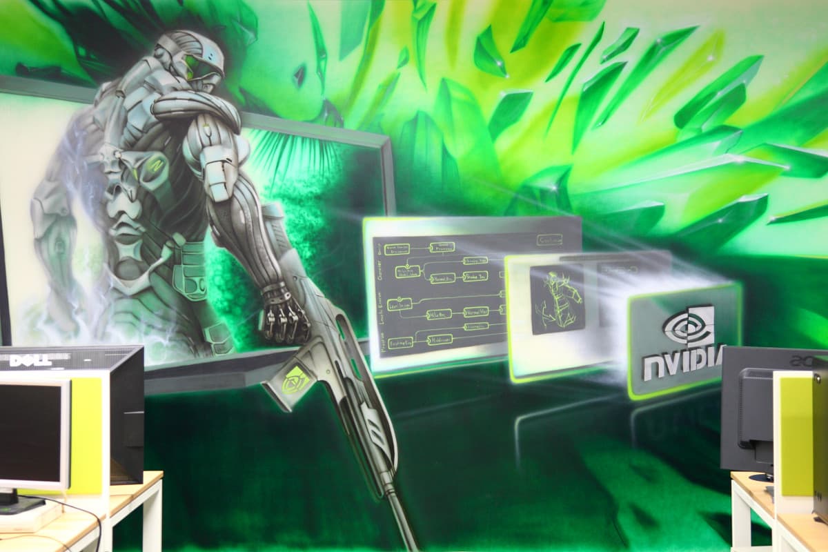 Кстати, на данной фотографии видна стена с большим рисунком, имеющим отношение к играм. Для росписи этой стены на втором этаже офиса компания пригласила талантливого художника и давнего поклонника NVIDIA Антона Мирошникова. В качестве темы для рисунка была выбрана игра Crysis — одна из любимых игр компании NVIDIA и, как оказалось, самого Антона тоже.