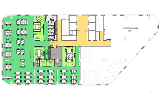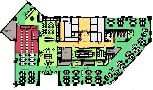 Итак, приступим к знакомству с московским офисом. Компания NVIDIA занимает почти два этажа одного из зданий бизнес-центра «Двинцев» — второй и часть третьего. Второй этаж основной, и его центральной частью является компьютерная лаборатория (выделена красным цветом на схеме, предоставленной архитектурным бюро OFFICEPROJECT), о которой мы поговорим позже. Вокруг неё размещены рабочие зоны, переговорные и клиентские зоны, а также зоны для отдыха. Как видите, разделения на комнаты тут фактически нет, все сидят в одном большом пространстве.