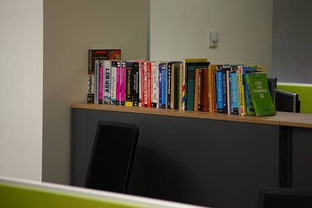 Если вы заметили, на полке можно увидеть небольшую библиотеку книг по программированию — не только Максима нашего Горького почитывают сотрудники компании!