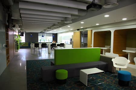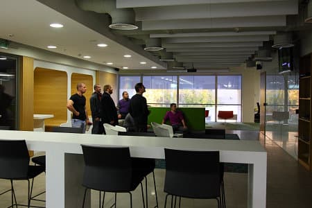 Там же рядом, на втором этаже, создана весьма комфортная зона отдыха (все они модно названы «collaboration area») для общих совещаний и неформальных встреч. Эта большая зона состоит из двух частей: рабочей зоны и небольшого кафе.