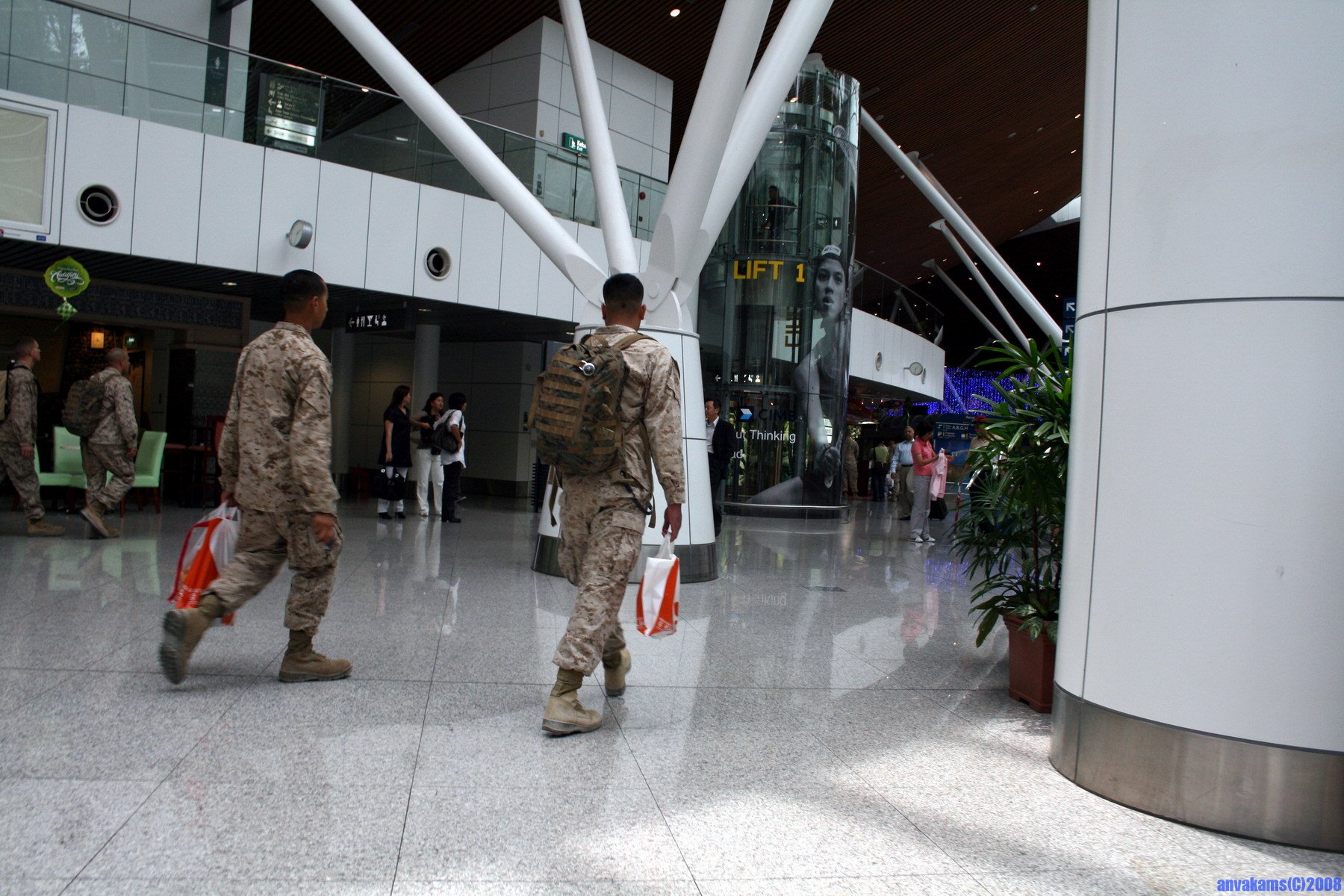 Это уже внутри второго здания, где гейты, в том числе и мой. Там уже причалил самолет сингапурских авиалиний. А по залу ходит множество американских солдат. Интересно, что у каждого на груди есть нашивка со званием и именем. То есть даже спрашивать не надо — кто ты такой. :-)