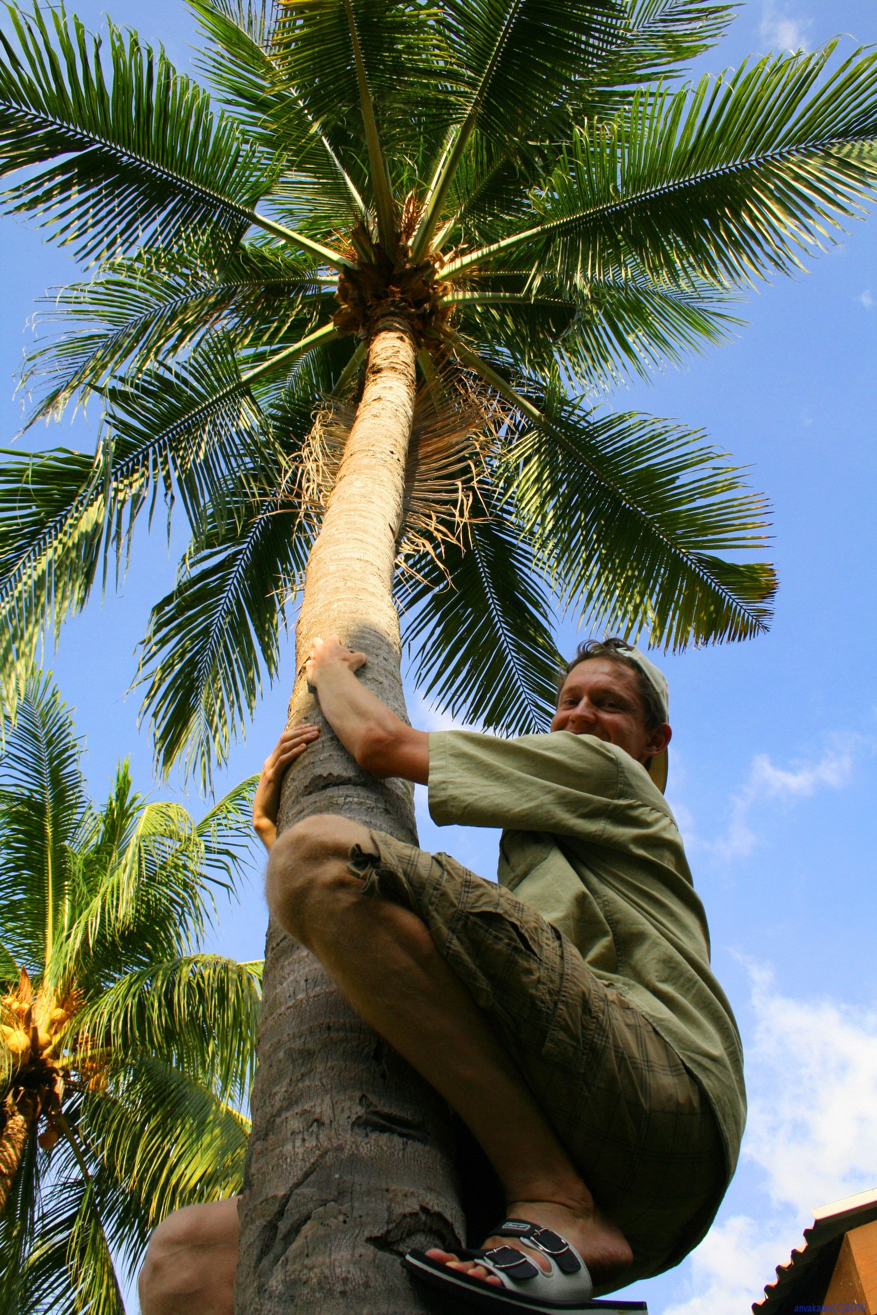 Первая попытка почувствовать себя сборщиком кокосов закончилась неудачно, на пальме было множество муравьев, потому Евгению сие очень не понравилось, и он переместился к другому "стебельку", как он выразился. "Стебелек" хоть и имел выщербины для того, чтобы влезть на него, выше 5 метров лезть Женя уже побоялся. И правильно.. Потому как если он залезет, и потом обуяет страх спуска, то придется забрасывать лассо на пальму и пригибать к земле. И не факт, что пальма не соскочит, и Женя не улетит с нее черти куда как с катапульта :)… Ведь все пальмы обладают потрясающей гибкостью..