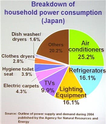 Даны значения для Японии, в других стран, в зависимости от климата, уровня развития и т.д. соотношение будет другим, но все равно на освещение будет расходоваться значительная часть энергии. Это подтверждает актуальность использования энергосберегающих ламп. Переход от лам накаливания к более экономичным флуоресцентным лампам уже почти завершен, но по сравнению с 2008 годом компания Panasonic изменила приоритеты. Сейчас активно продвигаются светодиодные (LED) лампы.
