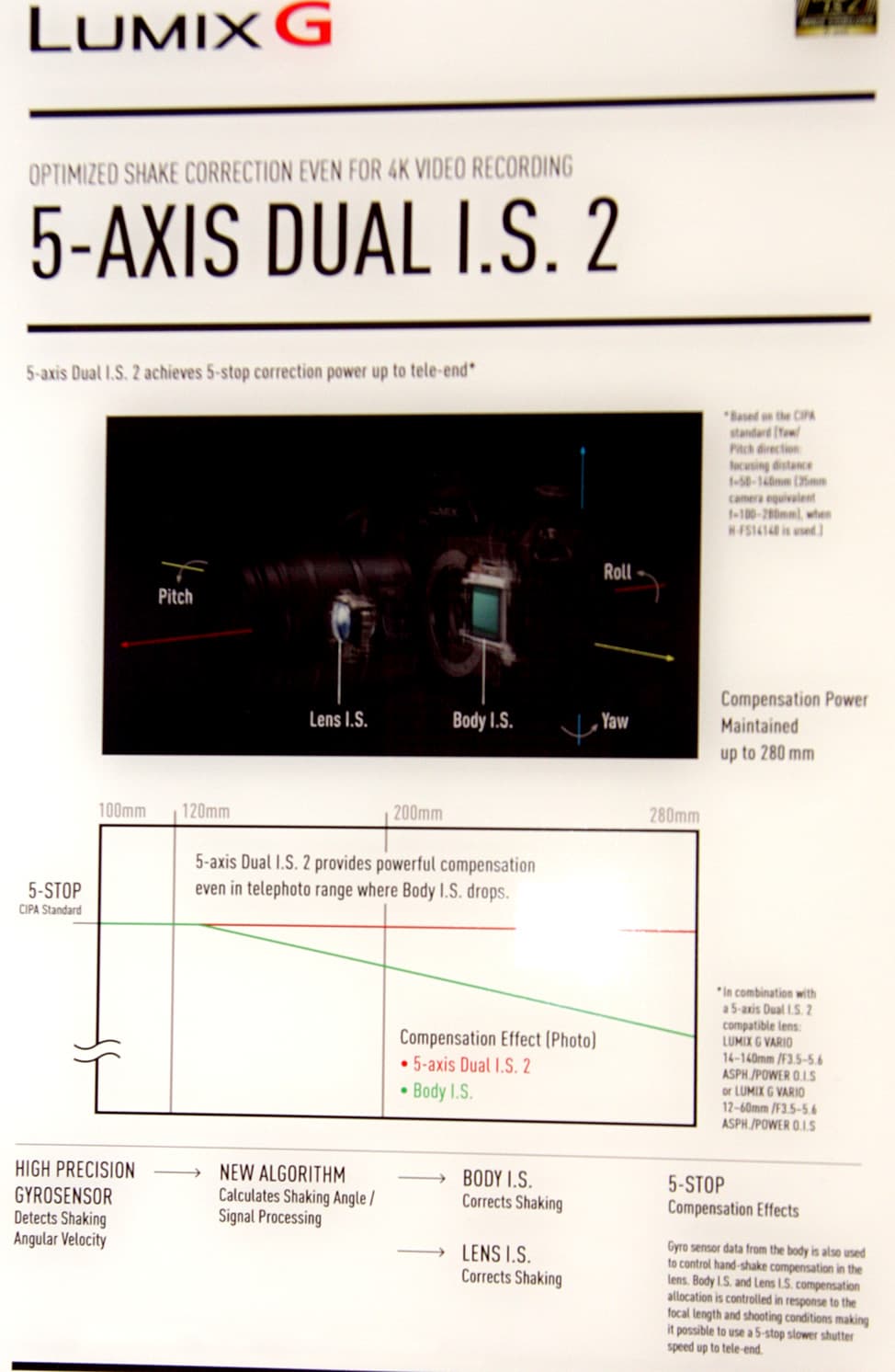 Среди множества выдающихся характеристик этой камеры особое внимание было уделено продвинутой пятиосевой двойной (в самой камере и в объективе) стабилизации (Dual I.S.), обеспечивающей увеличение выдержки на величину до плюс пяти ступеней даже при фокусном расстоянии 280 мм.