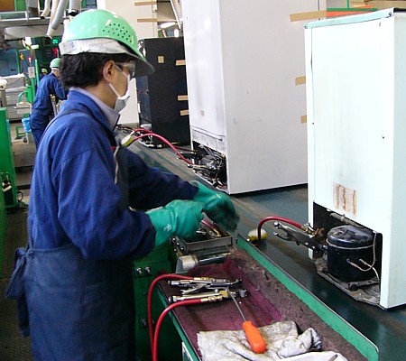 При этом тщательно извлекаются фреон и компрессорное масло. Теплообменники измельчаются, из полученной смеси магнитами извлекаются частицы железа, а на вибрационном сепараторе медь отделяется от алюминия. Компрессоры также измельчаются, магнитами из смеси извлекается железо, сепаратором, работающим на вихревых токах, отделяются кусочки меди, затем повторно проводится извлечение частиц железа магнитами.