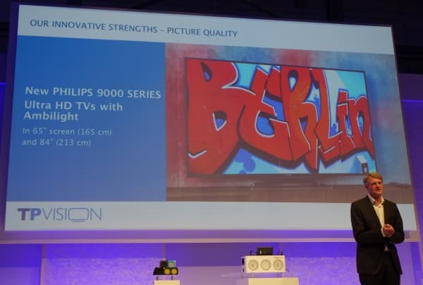В этом году TP Vision гордилась на выставке своей 9000-й серией телевизоров Philips TV с разрешением Ultra High-Definition в 3840×2160 пикселей (4K) и трехсторонней подсветкой Ambilight. Телевизоры представлены с диагоналями 165 см и 213 см (65 и 84 дюймов), доступны на европейском и российском рынке по рекомендованным ценам от 5 до 15 тысяч евро.