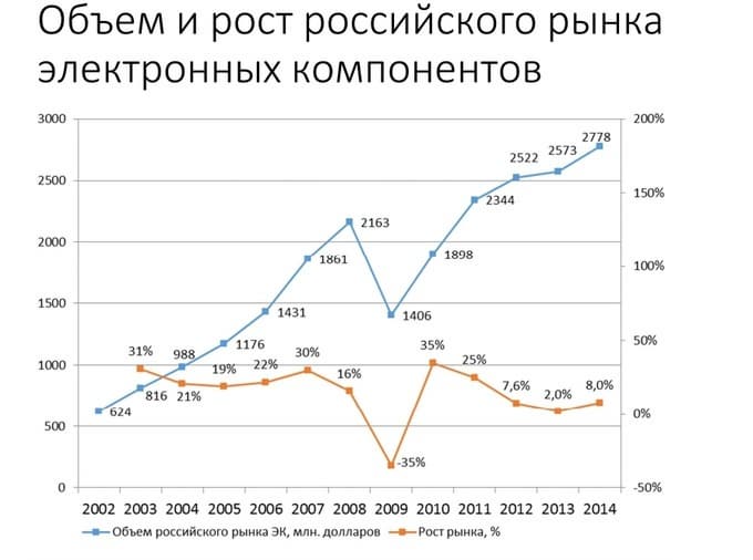 Переходя к состоянию российского рынка, начнем с нескольких цифр. Общий объем рынка электроники в России составляет 34 млрд. долл. Производство электроники — 6 млрд. долл. (18%), контрактное производство — 710 млн. долл. (т. е. всего 2% от общего объема рынка).