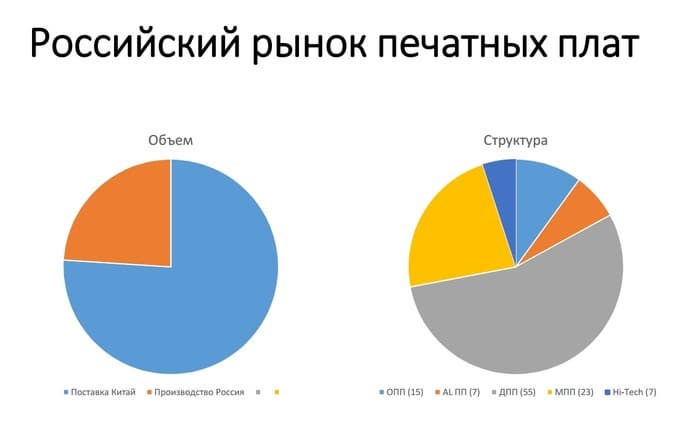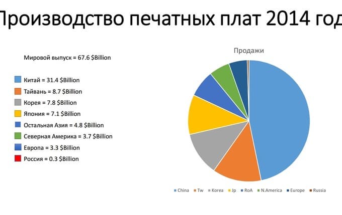 При этом для России указан весь рынок печатных плат, если брать собственно производство, то это где-то 25% от 300 млн (т. е. около 80 млн. долл.), и такая доля на графике будет вообще незаметна.