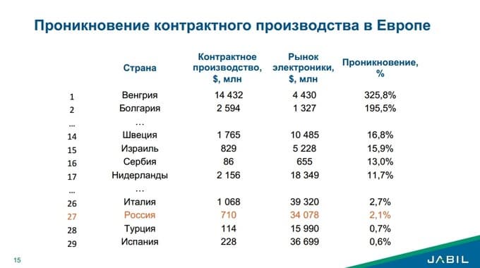Если подходить ближе к России, то стоит отметить, что контрактное производство электроники в России невелико даже в сравнении с другими европейскими странами.