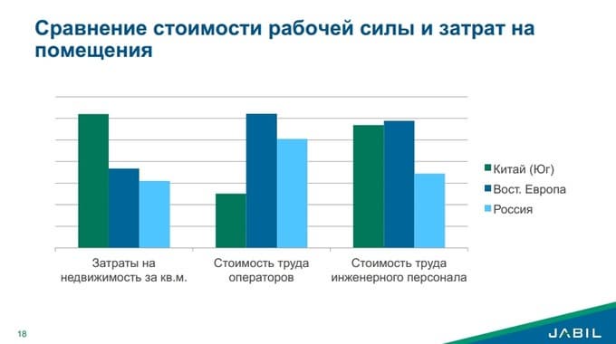 Если Китай заметно выигрывает по стоимости труда операторов (т. е. относительно неквалифицированных сотрудников), то Россия гораздо выгоднее с точки зрения стоимости инженерного персонала.