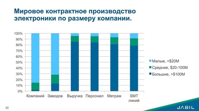 Для мирового производства электроники действует тот же закон, что и для многих других отраслей промышленности: «20% крупнейших компаний держат 80% рынка, а оставшиеся 80% мелких предприятий — 20% рынка». Даже немного нарушается в пользу крупных компаний.