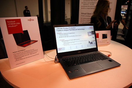 А на стенде Fujitsu нам показались наиболее интересными два экспоната. Первым из них стал ультрабук Fujitsu Lifebook U904, отличающийся не только компактными размерами и весом (для своего класса, разумеется), отличным IGZO-экраном высокого разрешения, но и продвинутой системой безопасности в виде встроенного сенсора не просто отпечатков пальцев, а распознавания пользователя по рисунку вен ладони.
