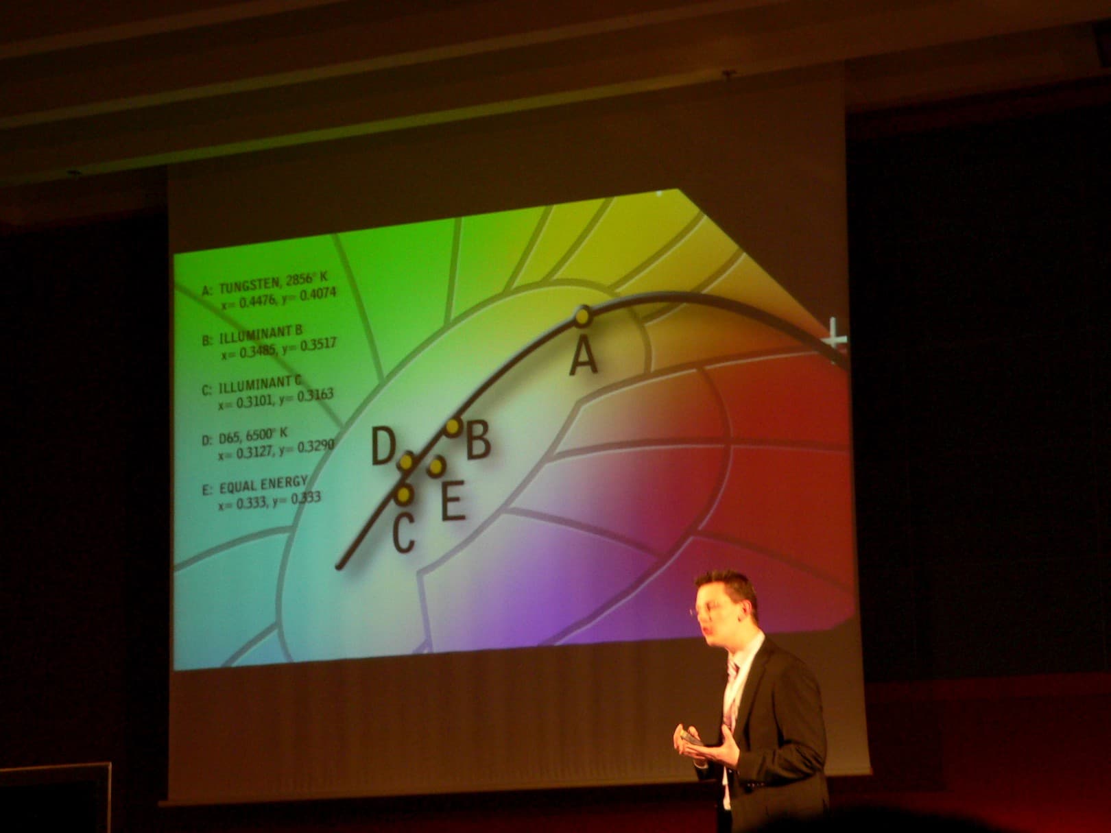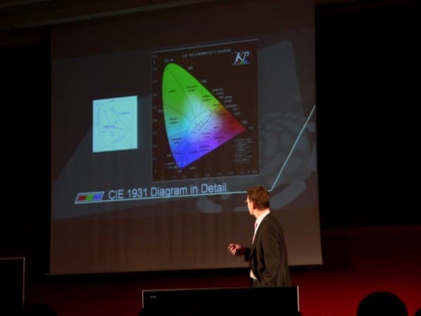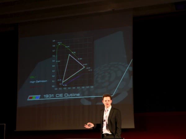 Но есть и еще один нюанс, состоящий в том, что еще одним параметром, влияющим на фактическое отображение цвета на экране, является цветовая температура. Формально сама эта настройка, в явном виде присутствующая в меню многих мониторов, позволяет дизайнерам и тем, кто профессионально работает с цветом, подстроить изображение, чтобы скомпенсировать влияние фонового освещения. Поскольку глаза имеют свойство подстраиваться таким образом, чтобы белый цвет воспринимался белым вне зависимости от того, что в данных условиях освещения он фактически желтый или синеватый. И когда мы глядим, то на клавиатуру, то на экран, целесообразно, чтобы белый цвет на экране не сильно отличался от цвета клавиш или иных попадающих в поле зрения предметов, которые в сознании человека зафиксированы как белые. В таком случае мозгу не придется перенастраиваться каждый раз и восприятие цвета на экране будет более достоверным. Но когда мы смотрим кино на большом экране, ситуация иная, каким бы ни было фоновое освещение, глаза адаптируются к происходящему на экране, и здесь крутить цветовую температуру в идеале пользователь не должен совсем, поскольку имеется стандарт, на который ориентируются при монтаже видео в киностудиях. И почему же тогда, придя в магазин, где продаются телевизоры, мы видим стену с одинаковыми изображениями, но явно «разноцветными»? — риторически восклицает спикер. Как минимум, на настройках по умолчанию, цветовая температура должна быть одинаковой, то есть стандартной.