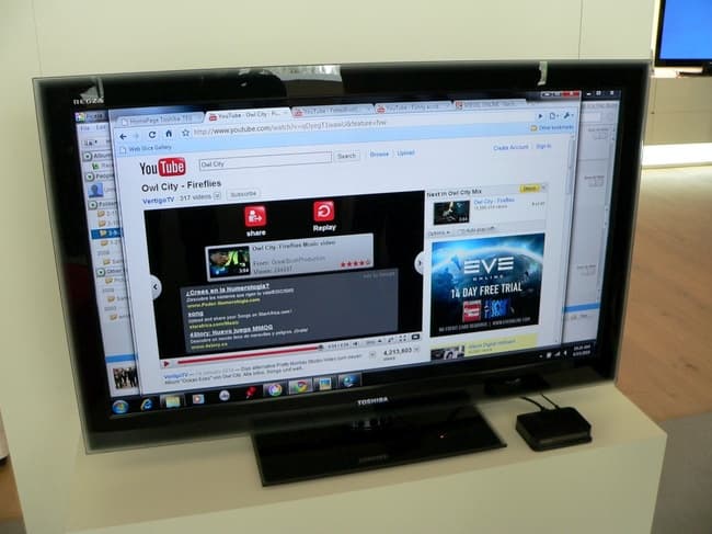 Новинкой, которую отдельно и с гордостью демонстрировали представители Toshiba, стал Toshiba Media Controller plug-in для Internet Explorer. Этот плагин позволяет буквально в одно касание перенаправить воспроизведение ролика YouTube с ноутбука на домашний телевизор (через DLNA), чтобы посмотреть его на большом экране. При этом компания упирает на потрясающую простоту: система настраивается сама (в том числе сама устанавливает связь между телевизором и ноутбуком), после чего остается лишь кликнуть мышкой, чтобы воспроизведение пошло на телевизор.