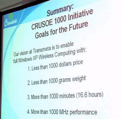 Суть инициативы можно передать одним слоганом: «CRUSOE 1000 - это мобильный ПК за $1000 (и менее), с 1000 МГц процессором, весом 1000 граммов (и менее), работающий в автономном режиме 1000 минут». Такой ПК, разумеется, будет работать под управлением ОС Windows XP.