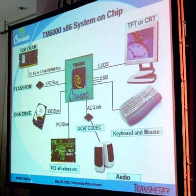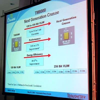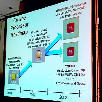 Печально, но выпуск чипа Crusoe TM6000 с 128-битными внутренним представлением VLIW инструкций и интегрированным графическим адаптером отложен до 2003 года (ранее указывался конец 2002 года). Помимо этого, в роадмэпе компании появился ранее подразумевавшийся, но не имевший имени процессор TM8000, который, по аналогии с TM6000, представляет из себя интегрированную «систему-в-чипе» со внутренней обработкой 256-битных VLIW инструкций. Чип TM8000 также ожидается не ранее 2003 года.