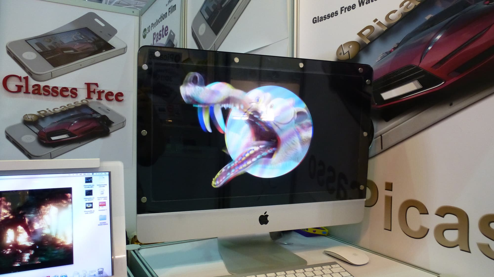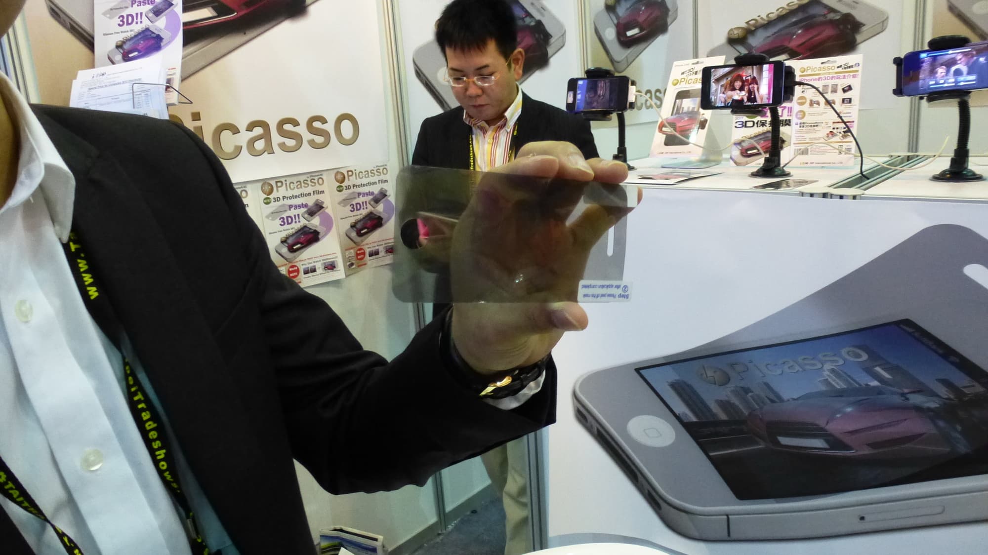 Ещё один пример удачной идеи был показан на стенде японской компании Picasso. Ей принадлежит производство защитной плёнки различных размеров, но плёнки необычной. Она может наклеиваться на любые экраны: смартфонов, планшетов, ноутбуков, или даже обычных мониторов. После этого экран превращается… в 3D монитор!