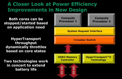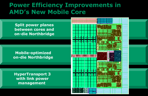 Среди таких нововведений — адаптивное разделение мощности между ядрами (каждое из ядер может быть остановлено/запущено в зависимости от требования приложений) и интеграция в процессор северного моста системной логики (с поддержкой более экономичной памяти DDR2) с оптимизацией последнего по мощности, а также новая шина HyperTransport 3 со встроенным управлением рассеиваемой мощности (динамический троттлинг на основе анализа состояний ядер).