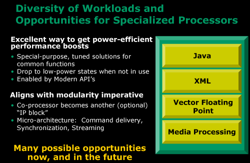 Здесь возможно большее снижение энергопотребления аппаратных решений за счет применения оптимизированных макроархитектур. Возможно, такие специализированные ядра позднее будут встраиваться и в процессоры общего назначения.