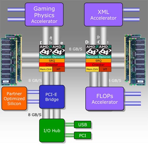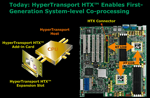 Интересным здесь является не только использование HyperTransport HTX, но и, например, использование специализированного ускорителя, размещенного в сокете вместо обычного процессора — «Socket Filler». И уже нашлись сторонние разработчики — например, компании DRC Computer и XtremeData, объявившие о выпуске динамически конфигурируемых чипов FPGA, совместимых по разъему с AMD64 Opteron (на двух- и многопроцессорных платах) и ускоряющих специфические алгоритмы конкретного пользователя. В них помимо вычислителя используется статическая оперативную память и флэш-память.