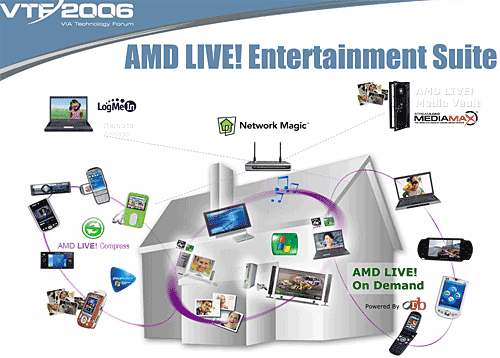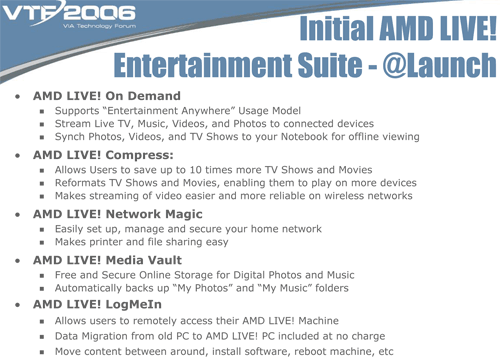 Другим ключевым докладом AMD на VTF 2006 стало выступление Рода Флека (Rod Fleck), почетного сотрудника AMD, курирующего направление мультимедиа для широкого класса пользователей (Consumer Multimedia). Он рассказал о решениях AMD в области цифрового контента высокой четкости (High Definition Digital Media), быстро набирающего популярности в мире. В понятие HD-контента включается не только аудио-видео и фотоматериалы соответствующего разрешения, но также соответствующие игры, запись HDTV-передач (DVR), перекодирование/сжатие мультимедиа, доступ к этому контенту одновременно из нескольких комнат, новые носители данной информации. Двухъядерные процессоры AMD64, по мнению сотрудников корпорации, как нельзя лучше оптимизированы для выполнения всех этих задач, поскольку имеют и отличную производительность в играх, и поддержку мультимедиа-инструкций, и 64-битную оптимизацию, и многопоточное выполнение, и встроенный контроллер памяти. Грядущая операционная система MS Windows Vista, где также будет сделан упор на HD-возможности, прекрасно работает на процессорах AMD64. Докладчик не замедлил проиллюстрировать это положение бенчмарками.