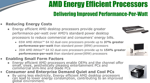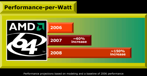 Прогресс процессоров AMD по соотношению производительности на расходуемый ватт мощности продолжится и далее, достигая уровней +60% в 2007 и +150% в 2008 году.