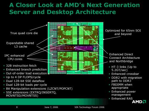 Как подчеркивает AMD, у нее, в отличие от Intel, — «истинная» 4-ядерная архитектура, так как это не объединенные в один корпус два независимых кристалла (как у грядущих скоро Intel Core 2 Quad), а единый кристалл с четырьмя ядрами и общими архитектурными блоками, включая общую кэш-память третьего уровня.