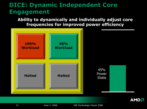 Технология Dynamic Independent Core Engagement (DICE) в этих процессорах AMD позволяет динамически и независимо менять частоту работы каждого ядра, чтобы уменьшить энергопотребление процессора без ухудшения производительности.