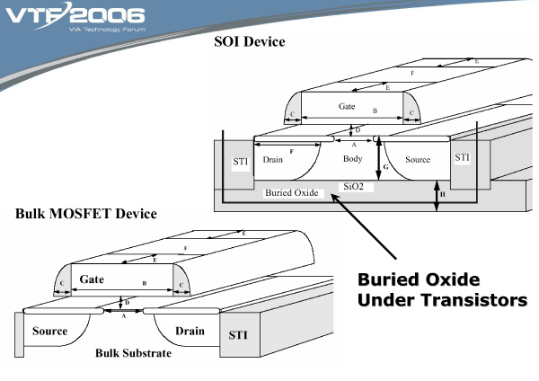 Отличие кремниевого транзистора, производимого по технологии SOI, от традиционного транзистора на кремниевой подложке проиллюстрировано на рисунке.