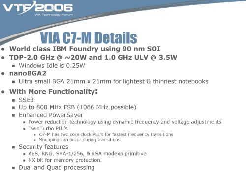 Далее докладчик из IBM перешел к применимости этой технологии для производства новейших процессоров VIA C7-M, предназначенных для мобильных и экономичных применений. Помимо собственно технологии, в новых чипах VIA C7 применяется и ряд архитектурных нововведений для снижения средней потребляемой мощности. Все вместе это позволяет поднять рабочую частоту процессоров до 2 ГГц без существенного увеличения TDP.