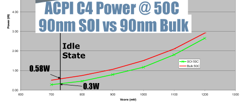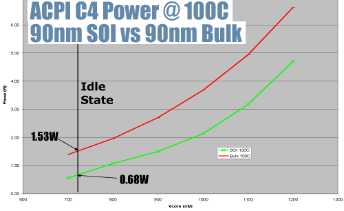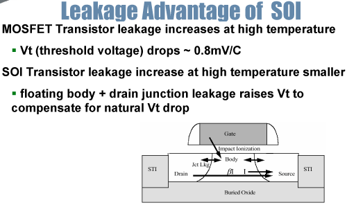Стойкость SOI -процессоров к утечкам при повышенной температуре кристалла иллюстрируют такие цифры: при температуре 50 градусов Цельсия потребление данных чипов в 1,8 раза меньше, чем у аналогичных кристаллов, изготовленных без применения SOI (0,3 ватт против 0,58 ватт), а при 100 градусах данный показатель составляет 2,25 раз (0,68 ватт у SOI против 1,53 ватт).