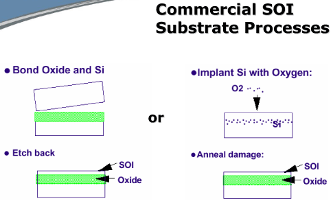 Первый фактически отделен от подложки толстым слоем качественного изолятора (оксид кремния), что позволяет исключить ряд паразитных эффектов. Коммерческий процесс производства подложек SOI с нанесением «рабочего» (то есть использующегося для создания транзисторов) слоя высококачественного кремния поверх изолятора может осуществляться двумя способами: плотным соединением двух подложек, на одной из которых предварительно создан слой оксида кремния (слева), или глубокой имплантацией атомов кислорода в подложку кремния, чтобы после отжига они сформировании встроенный слой оксида кремния (справа).