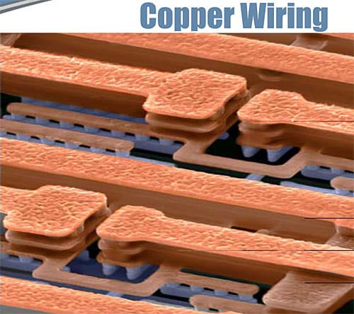 А это — фото медных межсоединений в данных кристаллах IBM (цветовая раскраска эти фото — искусственная, сделана для облегчения понимания).