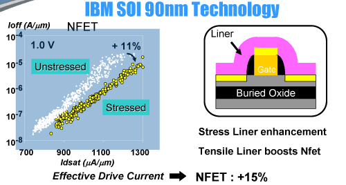 SOI-технологию IBM с нормами 90 нм отличает эффективная длина канала транзисторов 46 нм, локальное сжатие канала n-транзисторов для лучшего на 15% быстродействия (см. рисунок),