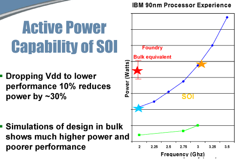 В результате, эти SOI-структуры IBM оказываются на 20-30% быстрее, чем стандартные 90-нм структуры других производителей. Это преимущество в скорости может быть превращено в меньшее энергопотребление. Например, пожертвовав 10-ю процентами быстродействия мы получим здесь 30-процентную экономию в общей мощности.
