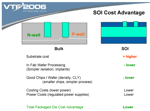 Производителем утверждается, что и по цене данный процесс производства в целом оказывается более выгодным: проигрывая традиционным структурам по стоимости подложки, SOI-кристаллы выигрывают у них по простоте обработки, выходу годных кристаллов, стоимости охлаждения готовых процессоров и банальной экономии электроэнергии.