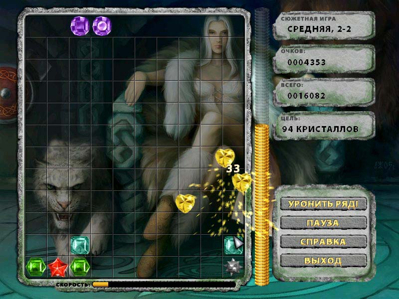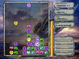 Сила обитателей волшебной страны скрывается в наделенных магией драгоценных камнях. У кого блестящих игрушек больше, тот и сильней, так как во время схваток и дуэлей они уничтожаются и разрушаются. Впрочем, задача игрока - не гонка магических вооружений и коллекционирование геологических редкостей, а банальная жажда наживы. Блестящие камешки - те же деньги, только превратить их в конвертируемый металл немного сложнее. Нужно составить в одну линию три, четыре или пять одинаковых по цвету и геометрической форме кристаллов. Для создания или завершения определенной комбинации «тащим» мышкой понравившийся кусочек бирюзы, аквамарина, изумруда, аметиста, топаза или горного хрусталя. Драгоценности с жалостным звоном разлетаются на кусочки и осколки, а у игроков в очередной раз пополнится счет. Ничего страшного, сверху небольшими порциями и целыми рядами нас «забрасывают» новенькими блестящими безделушками. В погоне за наживой никто и никогда не побрезгует воспользоваться бомбой - это еще старичок Бомбермен сказал. Не стала исключением и эта игра, где игроку в помощь выдается несколько разнообразных приспособлений обычного и магического происхождения. Время замедляется и ускоряется. Найденные волшебные палочки трансформируют и «перекрашивают» камешки. Молнии сжигают целыми рядами, а боевые жезлы расстреливают десятками несчастные цветные кристаллы. Устраивать переполох в виртуальных сокровищницах можно двумя способами - путешествуя по неизведанной волшебной стране или банально «рубить бабки» до бесконечности. Если выберете романтический вариант, то познакомитесь со многими интересными обитателями этой игры. Работа художников и дизайнеров Gaijin Entertainment вполне может считаться эталоном качества для игр данного жанра. Завораживающий блеск камней притягивает взгляд как магнитом, а за игровым полем всегда присутствует отличная картинка с изображением «хозяина» текущего этапа. Грозная владычица с верным четырехлапым охранником, летящая фея или задумавшийся дракон исполнены с выдающимся мастерством и внутренней душевностью. Честное слово, такие симпатичные «обои» впору на стенку вешать и самым дорогим гостям показывать. Diagnosis: Пожиратель времени