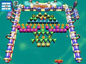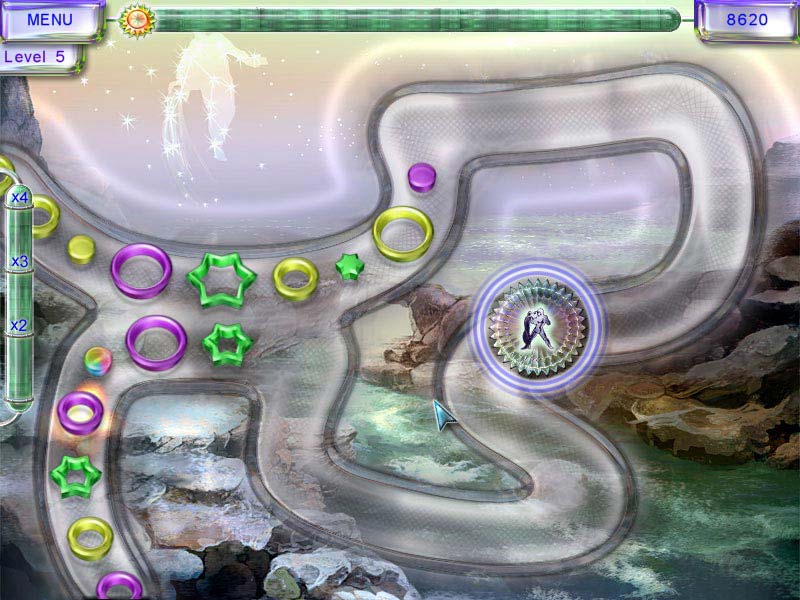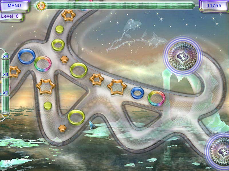Звезды стареют и гаснут, хотя по меркам человеческого века происходит это незаметно и о-о-очень долго. Задача игрока - всего лишь «зажечь» потускневшие зодиакальные созвездия, чтобы их было видно даже сквозь смог и электрический свет больших мегаполисов. По широким желобам к «центру» игрового поля ползут маленькие, средние и большие «звездочки» и «кружочки» в виде детских формочек разных цветов. Всего-то и нужно правильно сложить разнокалиберные заготовки «мышкой». Маленькую - в среднюю, среднюю в большую, и так далее. Комбинация «три в одном» должна быть соответствующей расцветки. Как только составили - «звезда» исчезает в ослепительном сиянии и освобождает, таким образом, часть игрового поля. Если рядом проезжает две или три формы, заполненные на 2\3 (например, уже составленные вместе большая и средняя), то последняя маленькая «звездочка» или «кружок» накроет сразу все заготовки, а не только одну свою. Детали радужной окраски игнорируют приоритетный цвет комбинации, и «пристроить» такую формочку гораздо легче, а охваченная огнем звездочка заберет с собой все заготовки свого цвета. Специальные бонусные «солнышки», если им полностью расчистить дорогу, устремятся к центру созвездия. Такой дополнительный заряд добавит яркости и света, и значительно ускорит прохождение уровня. Спокойная релаксирующая музыка, удачное графическое оформление, небольшая скорость и разумное увеличение сложности надолго отправят игроков в путешествие по космическим тоннелям. Что же до оценки труда разработчиков, то у них получилась симпатичная производная от оригинальной концепции знаменитого лягушонка Zum'ы. Diagnosis: Затягивает